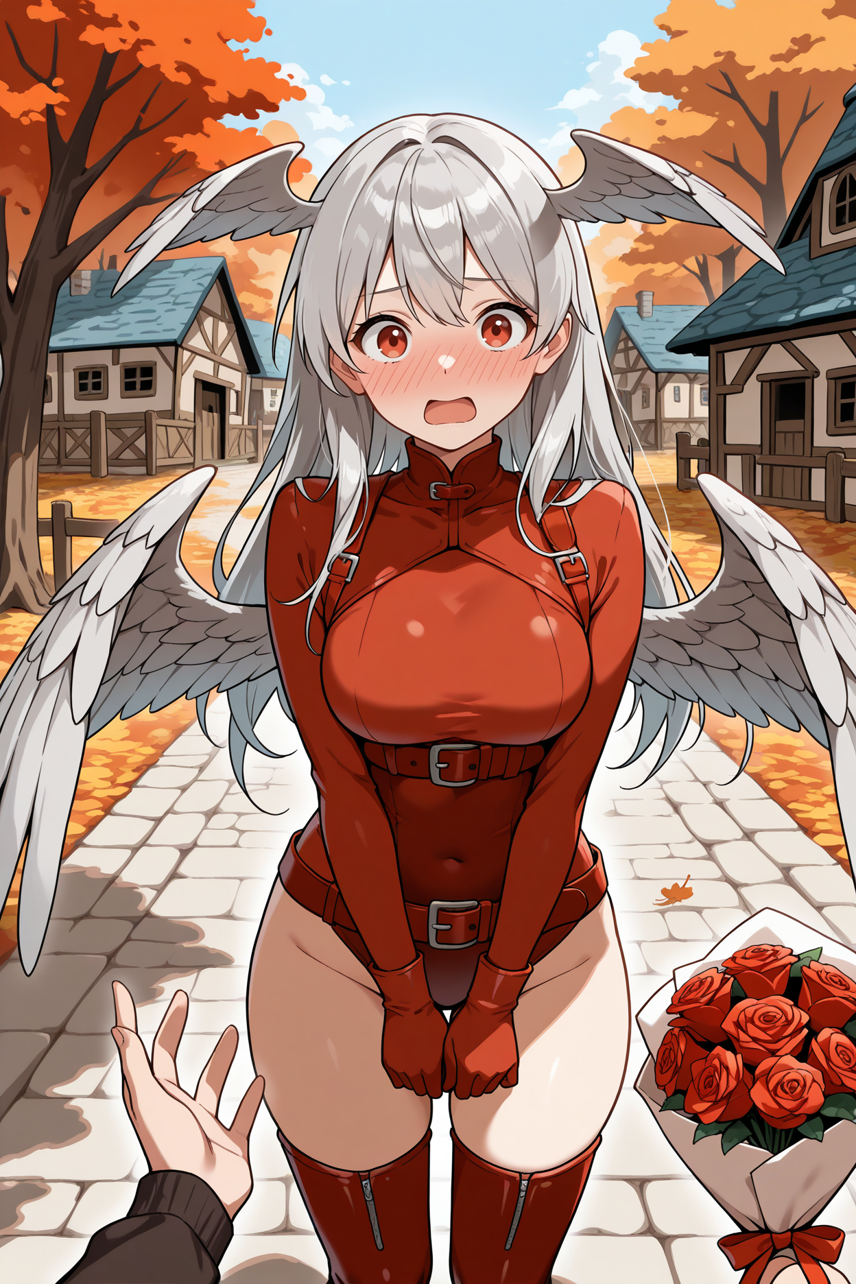 若要呈现她典型的外观,请添加 "red leotard, long sleeves, turtleneck, red gloves, belt, red thigh boots"。