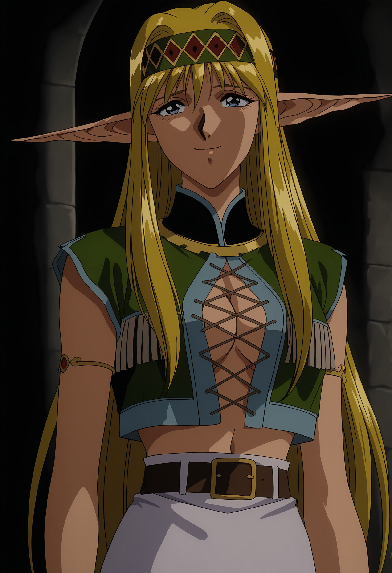 角色标签:mayfair, 1girl, 金发, 极长发, 蓝眼, 尖耳, 中等胸部, 发带, 绿色短上衣, 中央开口, 白色裙子, 腰带, 臂环,