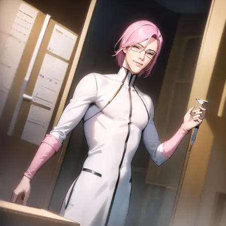 best quality, masterpiece, original art, full body, 1man, solo, (adult:1.4), (slim), ((skinny)), (((slender))), tall, sexy, handsome, attractive, (white kilt:1.4), (white turtleneck), (white leggings), (white clothes), (((adult face))), (((manly face))), ((long face)), (((Keanu Reeves haircut))), hair over one eye, (((pink-haired))), (((smiling))), (((yellow eyes))), (((white glasses))), handsome symmetrical face, posing sexy, perfect face, 8k네거티브: