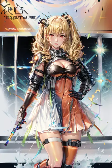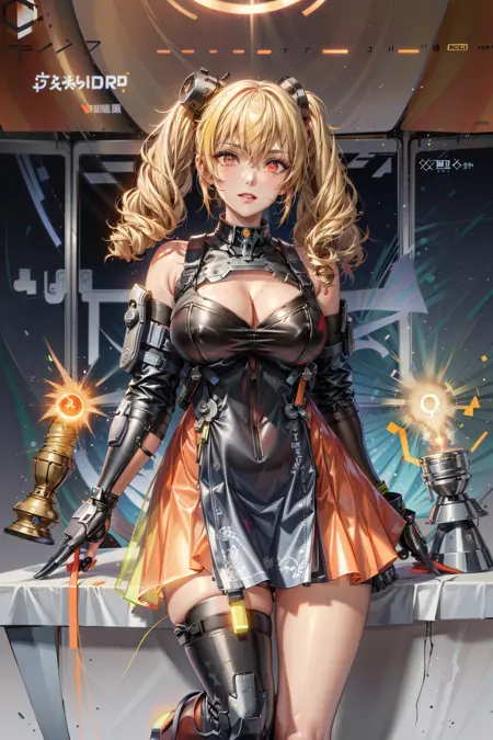 FennyBSE breastplate, FennyBSE drill hair, twin drills, FennyBSE hair ornament, FennyBSE gloves, FennyBSE high-waist two-tone skirt, thigh strap, single thighhigh, orange skirt,