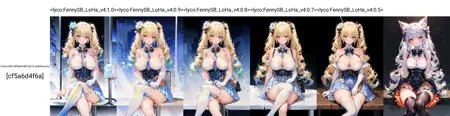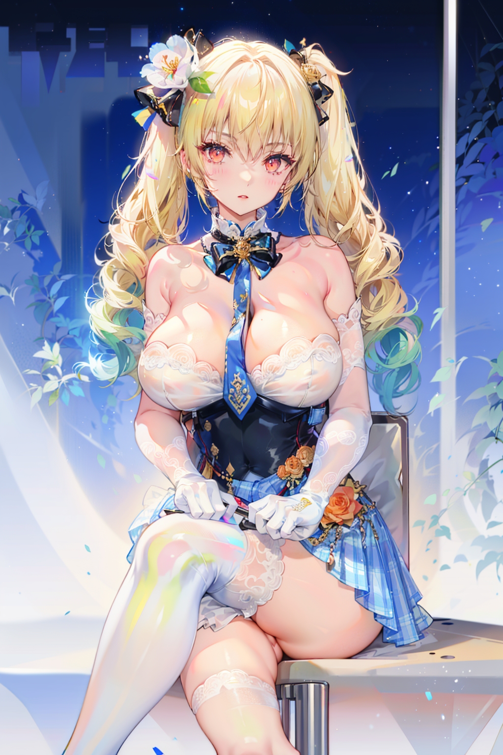 FennyDLS, FennyDLS gradient thighhigh, FennyDLS drill hair, twin drills, FennyDLS hair bow, FennyDLS hair flower, single thighhigh, FennyDLS necktie, FennyDLS floral bowtie, FennyDLS white floral gloves, FennyDLS floral lace, bare shoulders, plaid blue skirt, miniskirt,