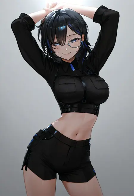 衣装タグ: 黒いトップス, 腹見せ, 黒いショートパンツ