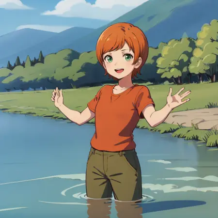 짧은 머리, 주황색 머리, 녹색 눈,