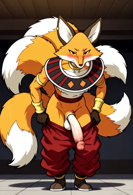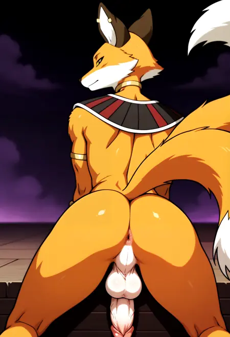 l1qu11r, fox boy, yellow sclera, black eyes, earring, usekh collar, red pants, shoes