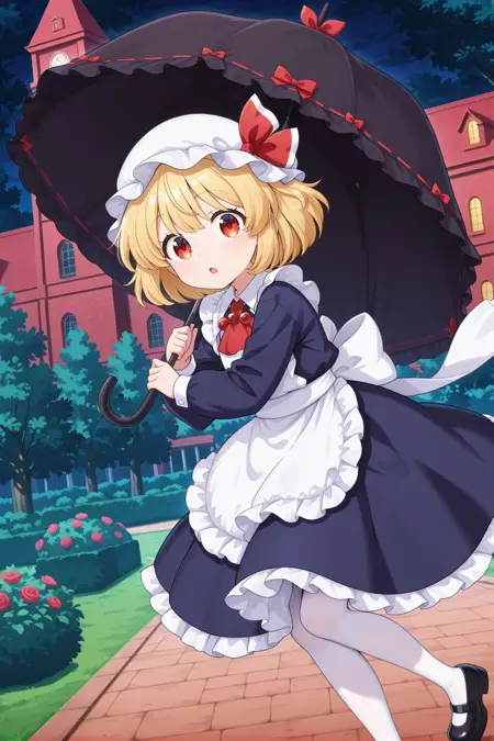 rumia, 1girl, solo, red eyes, blonde hair, short hair, rumia \(youkai maid among the fairies\), alternate costume, mob cap, white hat, hat ribbon, red ribbon, maid, red neck ribbon, blue dress, long sleeves, maid apron, white apron, frilled apron, frilled skirt, waist apron, back bow, white bow, white pantyhose, mary janes, holding umbrella, black umbrella,