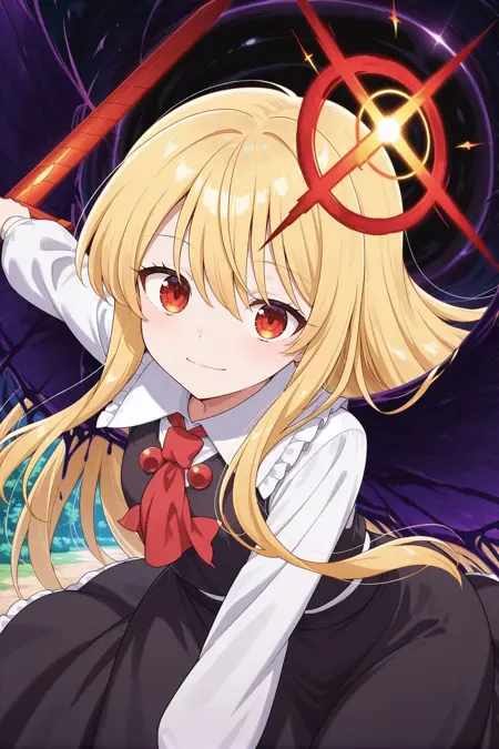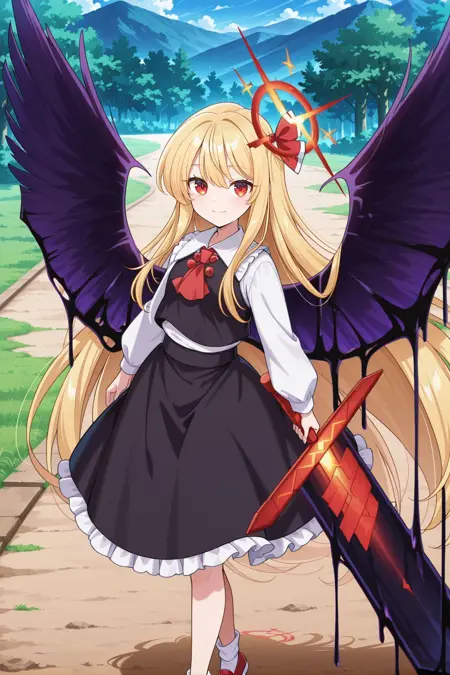 rumia, 1girl, solo, red eyes, blonde hair, very long hair, aged up, red halo, purple wings, black wings,, rumia \(youkai of the darkest dusk\), aged up, hair ribbon, red ribbon, red ascot, black vest, collared shirt, white shirt, frilled shirt collar, long sleeves, black skirt, frilled skirt, white socks, mary janes, red shoes,