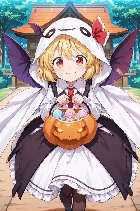 rumia, 1girl, solo, red eyes, blonde hair, ribbon, short hair, fang, hair ribbon, red ribbon, rumia \(koakuma-like youkai\), fake bat wings, black footwear, black pantyhose, black skirt, black vest, candy, collared shirt, cosplay, demon wings, frilled shirt, frilled skirt, black frills, halloween bucket, halloween costume, head wings, holding bucket, jack-o'-lantern, koakuma \(cosplay\), layered skirt, long sleeves, vest, white shirt, white skirt, hood, white hood, white cape, ghost costume,