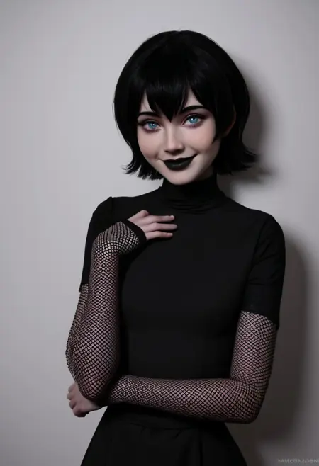 Mavis, blue eyes, short hair, stripped pantyhose, black hair, black dress, fishnet sleeves, solo, closed mouth, sneakers, black lips, high detail, pretty face, young face