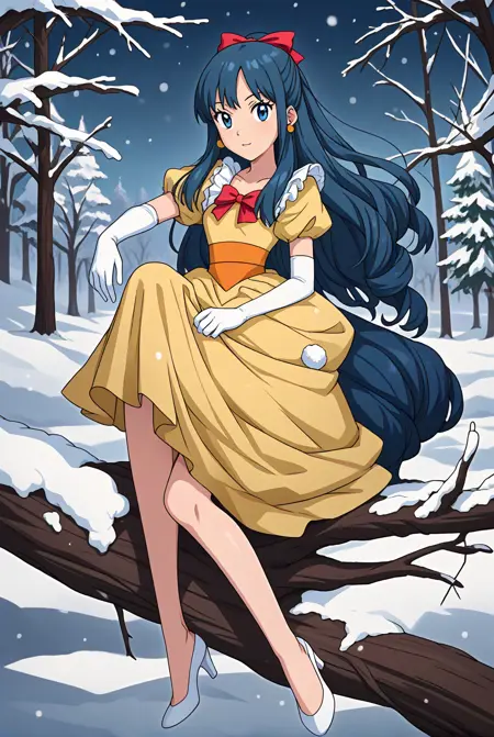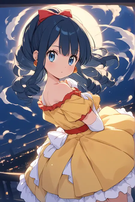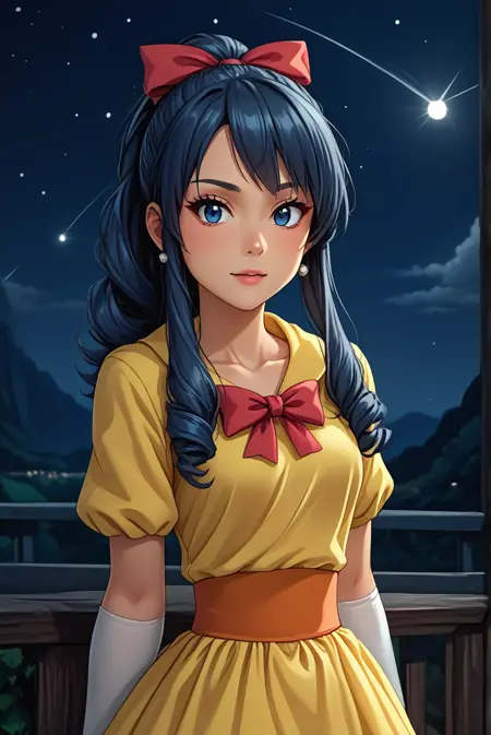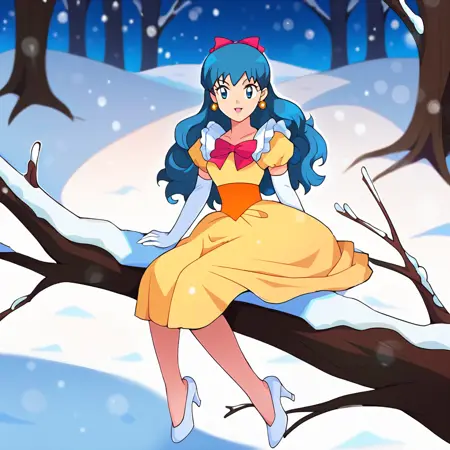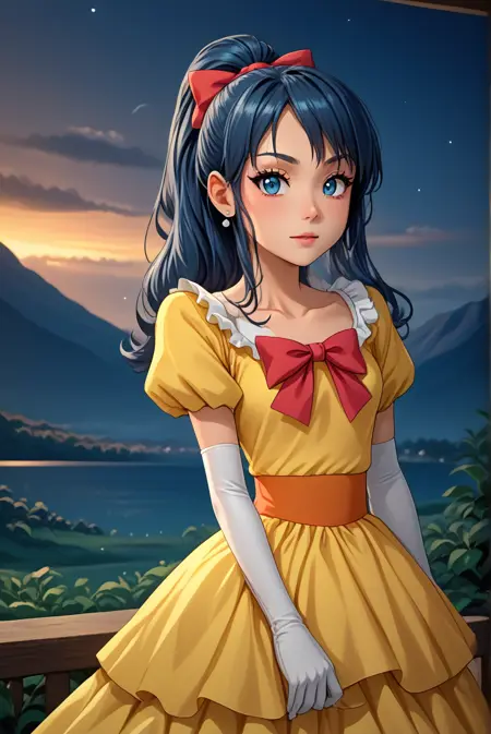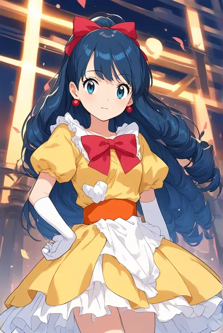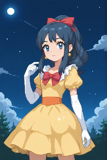 gfdawn, [dawn_\(pokemon\)], blue eyes, dark blue hair, long hair, drill hair, sidelocks, ponytail, yellow dress, short sleevees, earrings, hair ribbon, red bow, elbow gloves, white gloves, high heels, shoes, white footwear