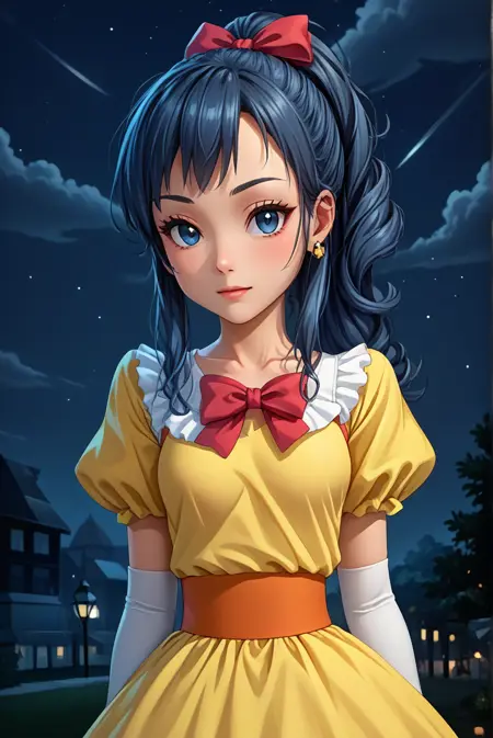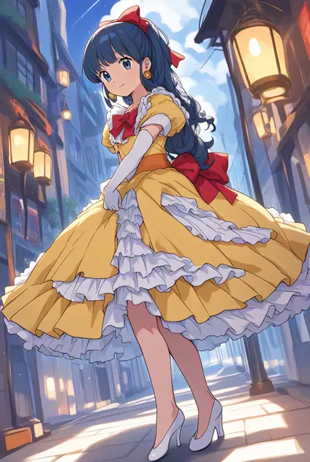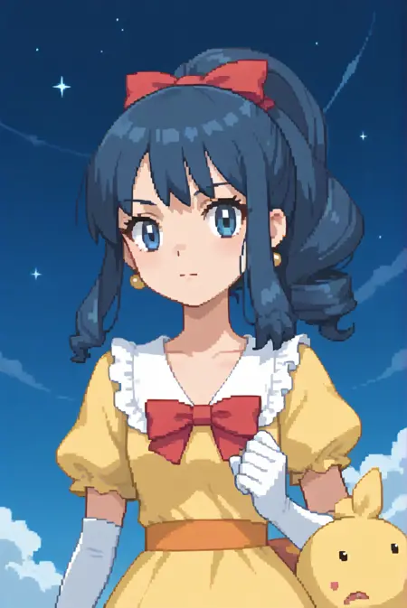 gfdawn, [dawn_\(pokemon\)], blue eyes, dark blue hair, long hair, drill hair, sidelocks, ponytail, yellow dress, short sleevees, earrings, hair ribbon, red bow, elbow gloves, white gloves, high heels, shoes, white footwear