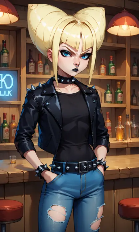 [默认服装]:金发,锥形发髻,蓝眼睛,眼线,黑色嘴唇,王冠,黑色夹克,长袖,黑色领结,黑色衬衫,有领衬衫,黑色裙子,竖条纹长筒袜,黑色踝靴