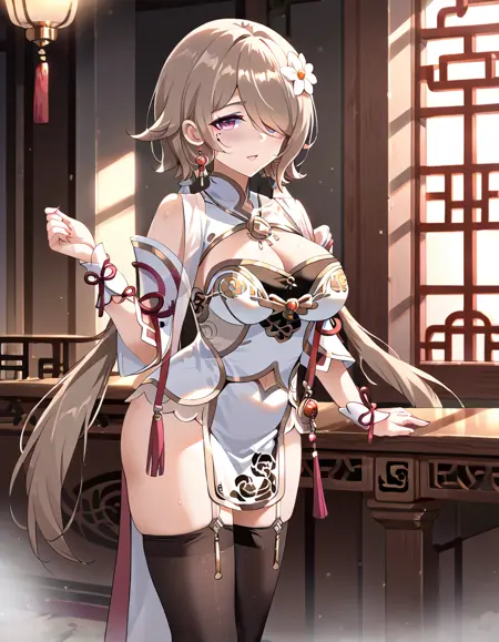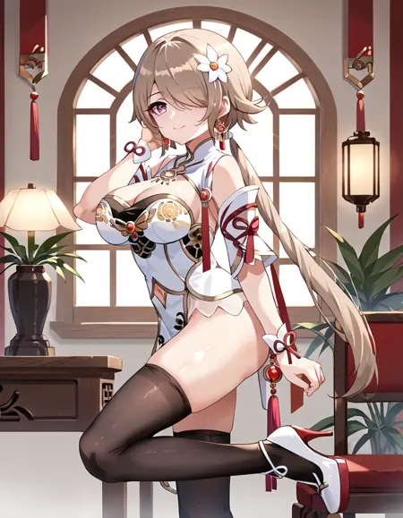 MaidOfCelestia,low twintails, MOC_thighhighs, black thighhighs, MOC_earrings, MOC_hair_flower, MOC_high_heels, MOC_china_dress, white footwear, navel