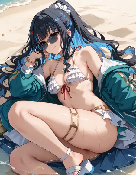 Tenochsummer1, ponytail, sum1 jacket, open jacket, sum1 frilled bikini, sum1 choker, sum1 sunglasses, sum1 hair scrunchie, sum1 jewelry, sum1 bracelet, sum1 necklace, sum1 thigh strap, thighlet, sum1 sandals,