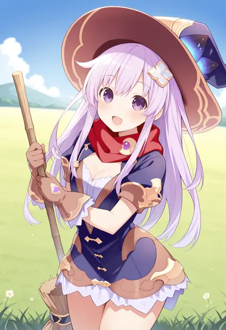 - gya4go, 女王帽, 髪飾り, ウィッチ, 赤いスカーフ, 青いドレス, 茶色の手袋, 太もも, ほうきを持っている, 青い靴,