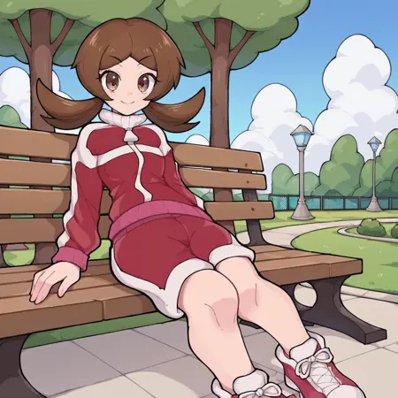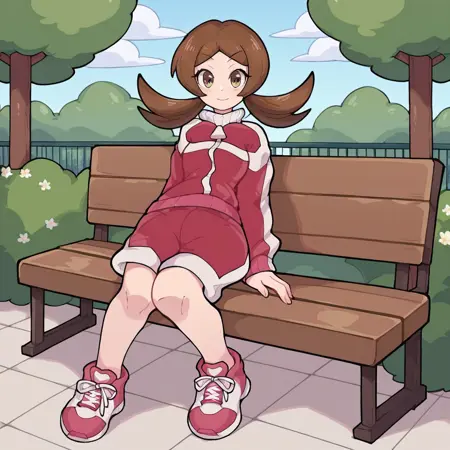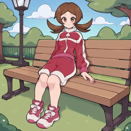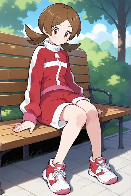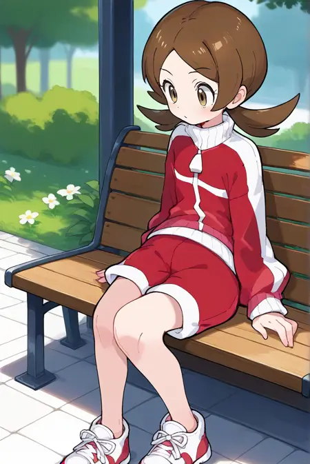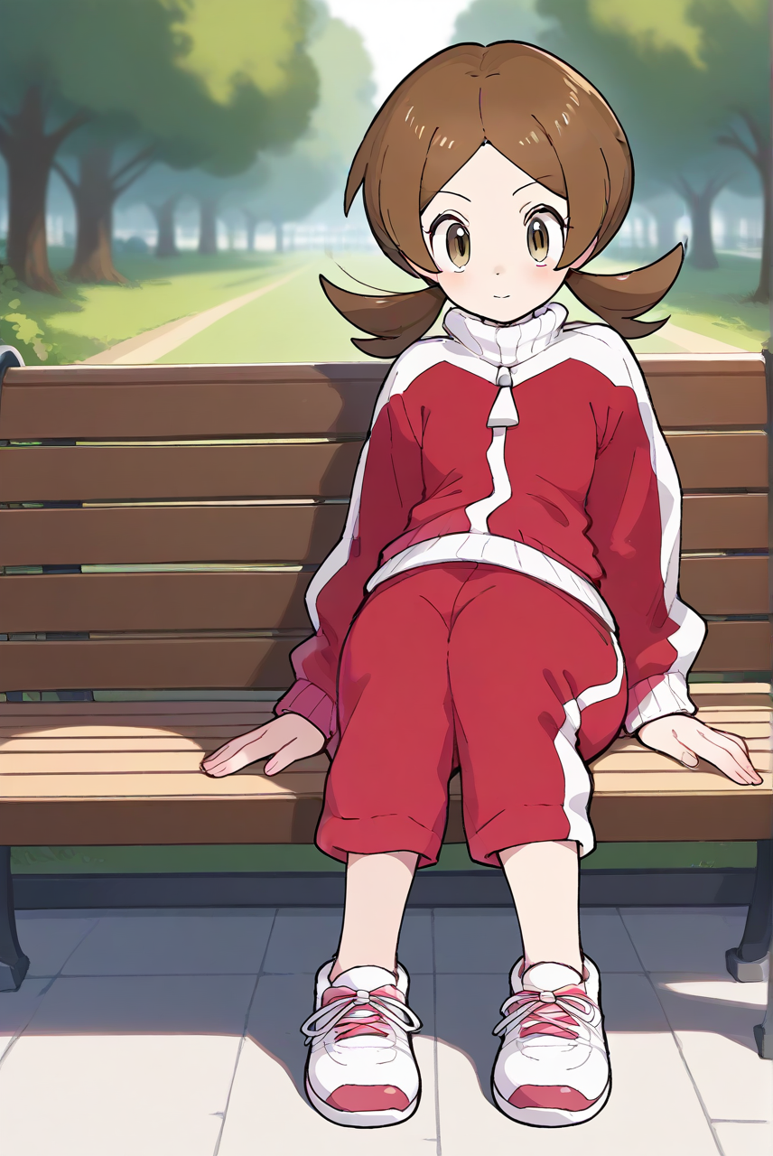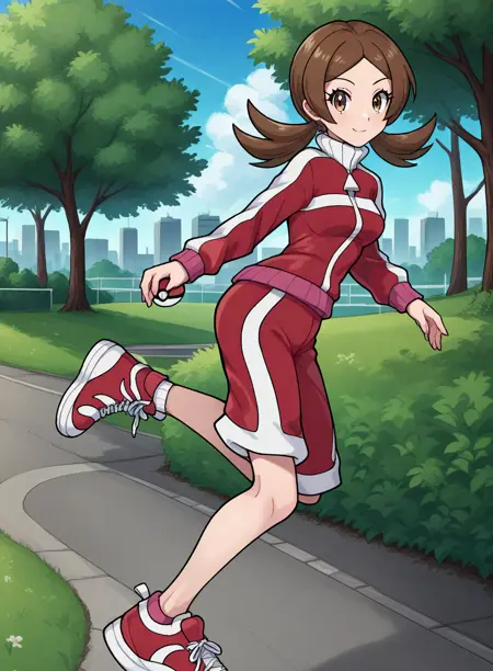 palyra, [lyra_\(pokemon\)], brown hair, brown eyes, twintails, track jacket, red jacket, zipper pull tab, long sleevees, red shorts, shoes, red footwear, white footwear