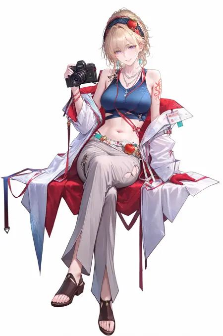 biancaPTN, bianca-def, 1girl, blonde hair, earrings, hairband, hair ornament, apple ornament, necklace, jewelry, crop top, midriff, navel, white_coat,open coat, long sleeves, id card, off shoulder, single glove, red glove, sandals, toenails,grey pants, bare shoulders, shoulder tattoo,