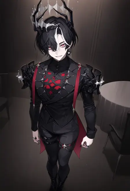 外观 + 触发词: lucienlunaris, 1boy, 黑发, 男性焦点, 黑色指甲, 一缕头发遮住一只眼睛, 短发, 红眼, 头发遮住双眼, 白发, 发色渐变, 双色发