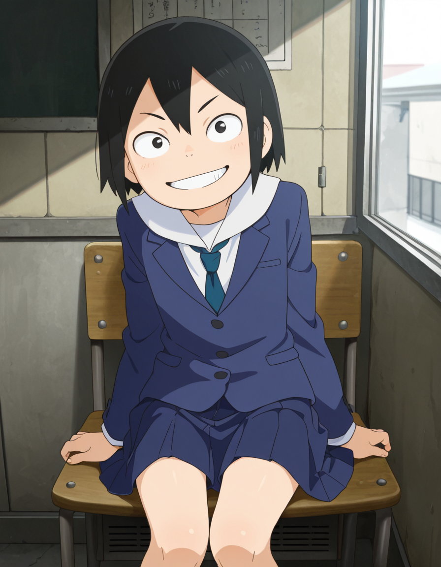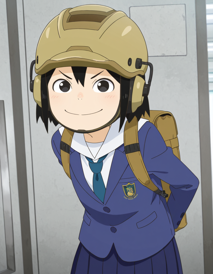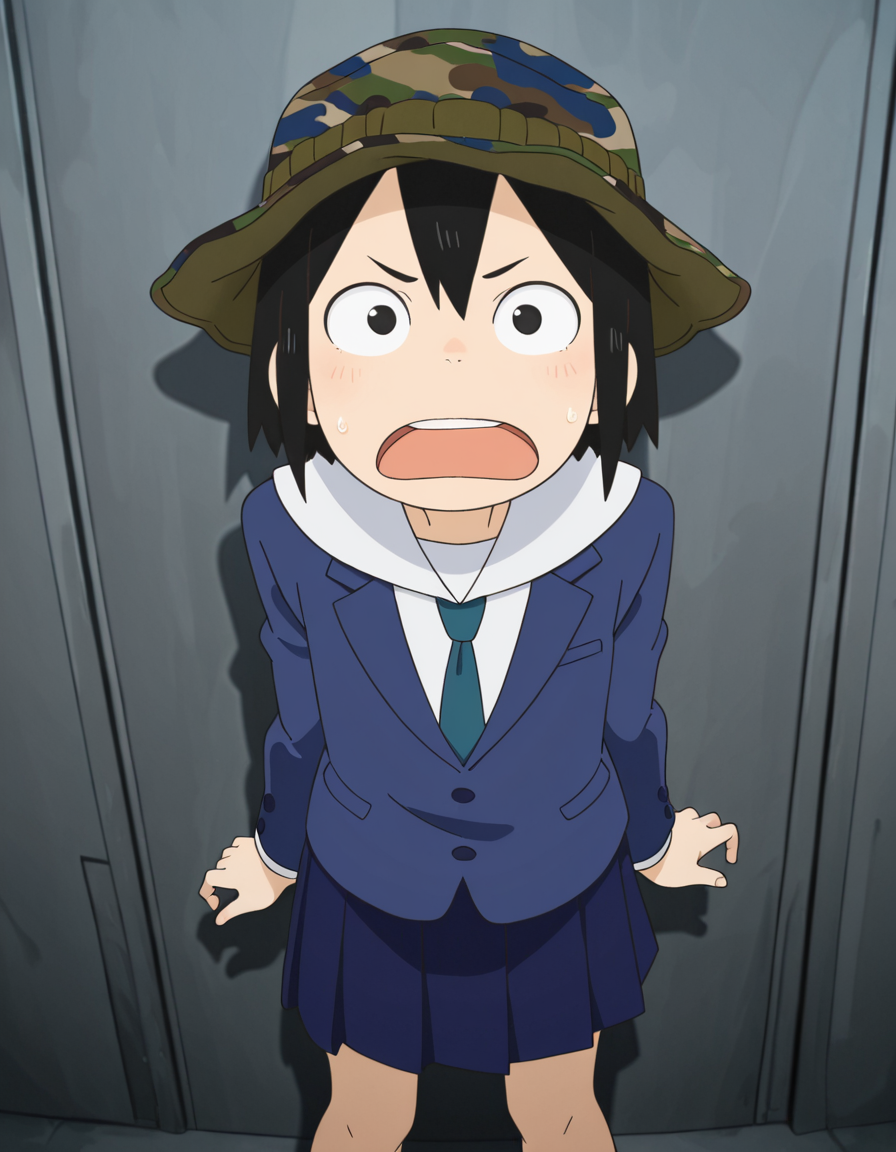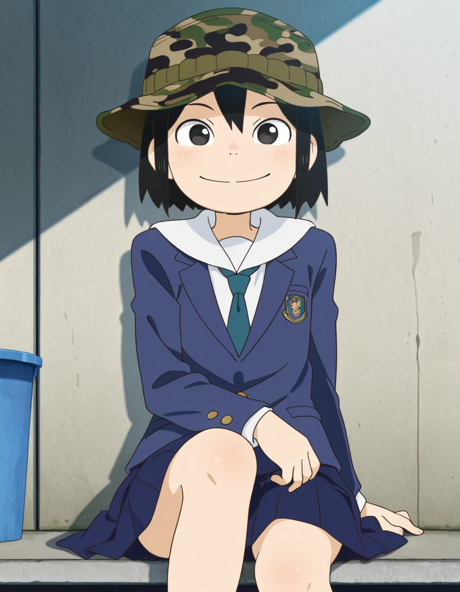 asakusamidori、ショートヘア、黒髪、黒目、バケツハット、カモフラージュハット、学ラン、ジャケット、ネクタイ、青スカート、ブレザー、プリーツスカート、靴下、茶色の靴