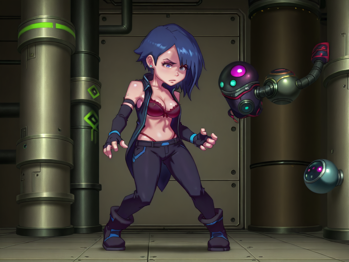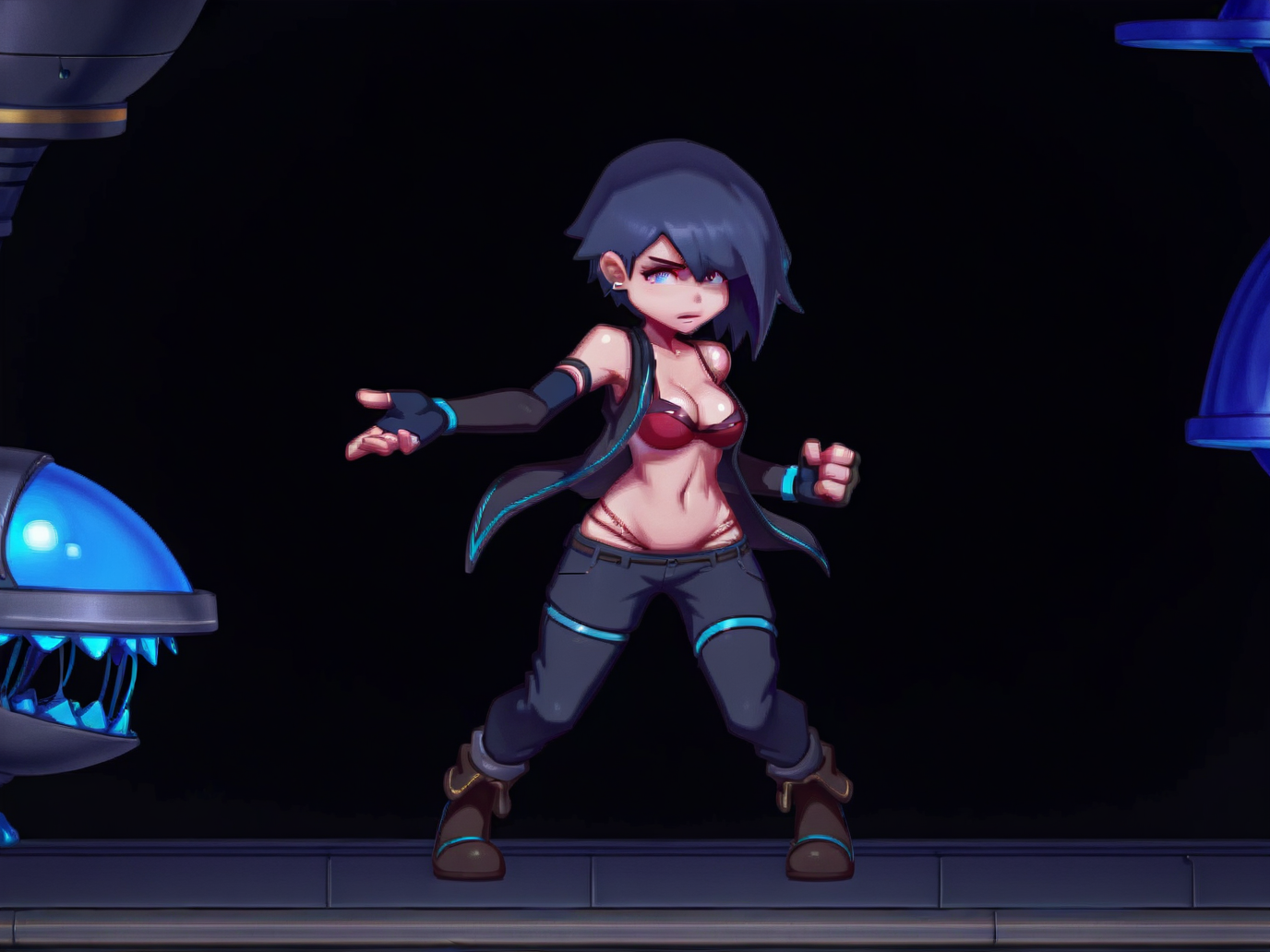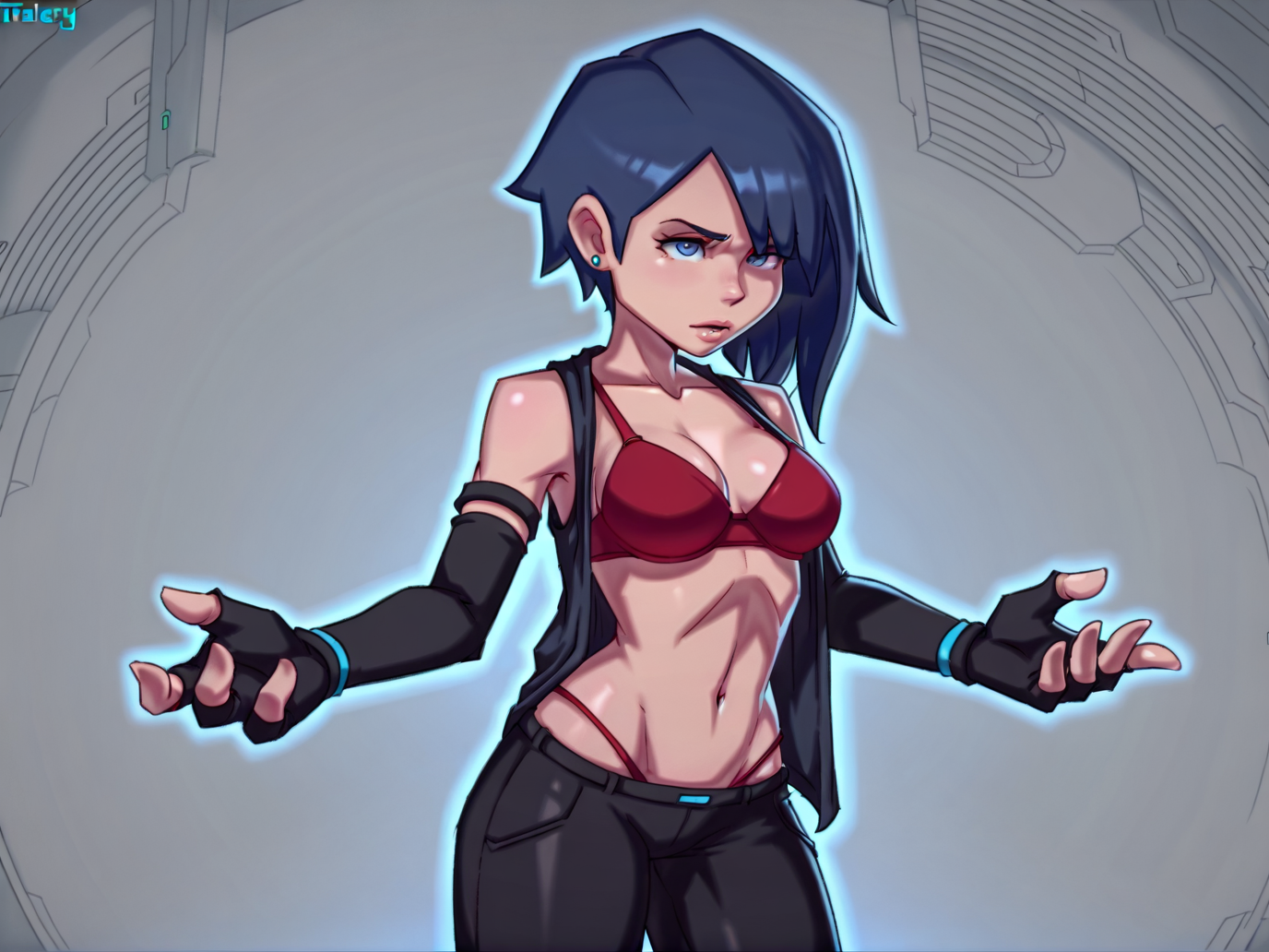 TaliaFF, 1girl, open clothes, blue hair, short hair, blue eyes, fingerless gloves, earring, red bra, black pants, tight pants, boots, panty straps, elbow gloves, bare shoulders,