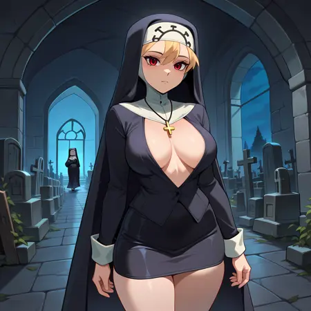 Optional: blonde hair, red eyes, closed eyes, habit, cross necklace, traditional nun, tentacles, monster, eldritch abomination