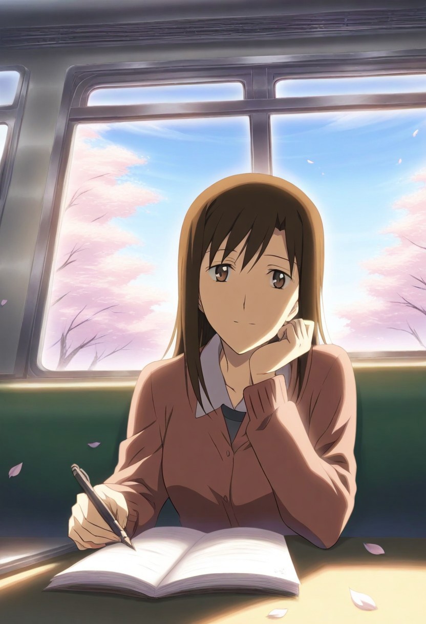 Akari Shinohara,black-brown hair,brown eyes,slim,Makoto Shinkai Style page,Bookstore procurement officer