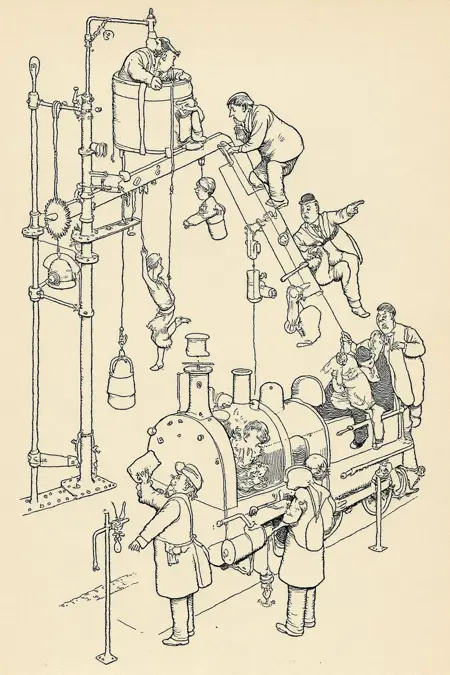 **希思·罗宾逊(英国)**早在20世纪初便已因绘制荒谬复杂的装置而闻名,远早于鲁布·戈德堡在美国获得类似声誉。