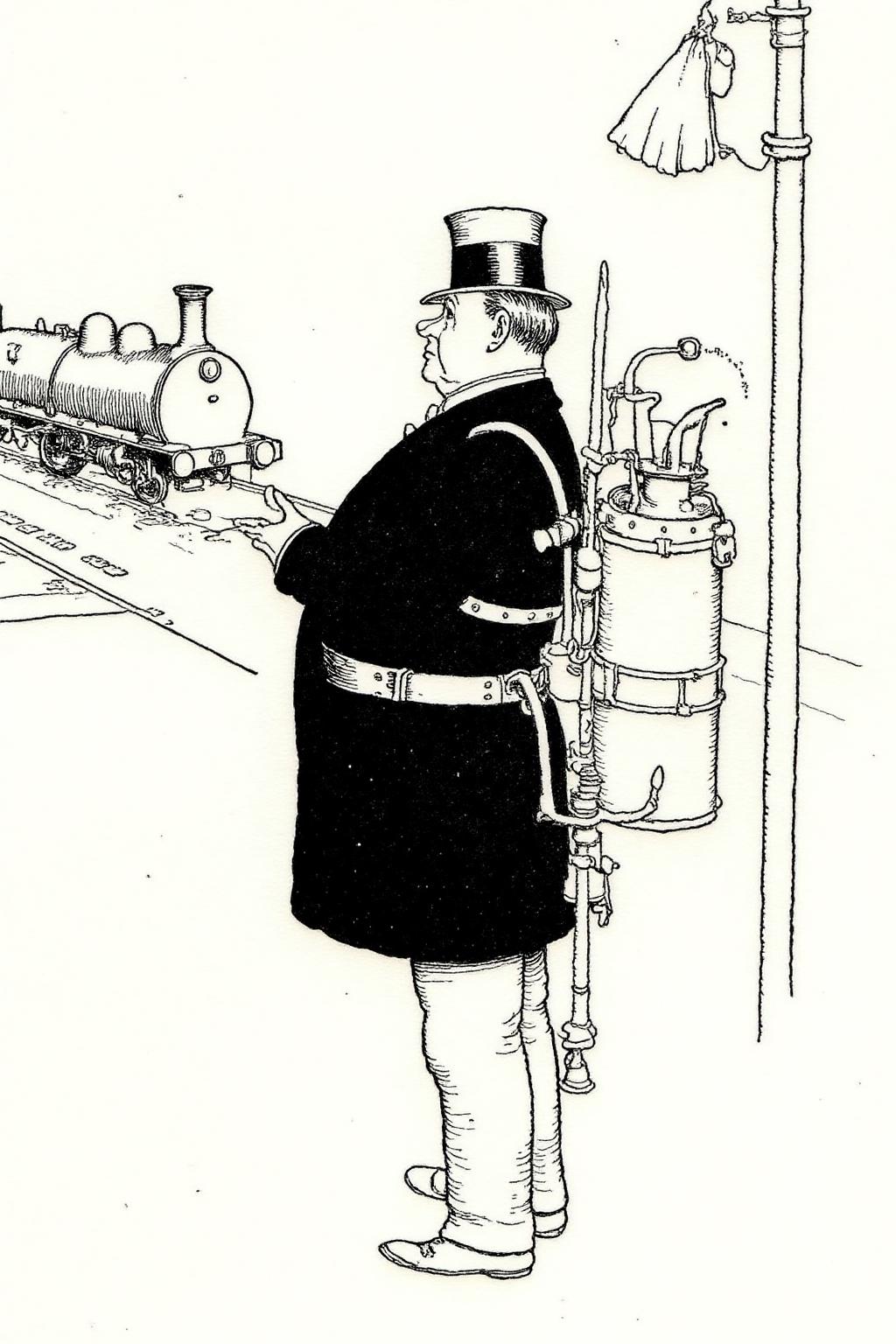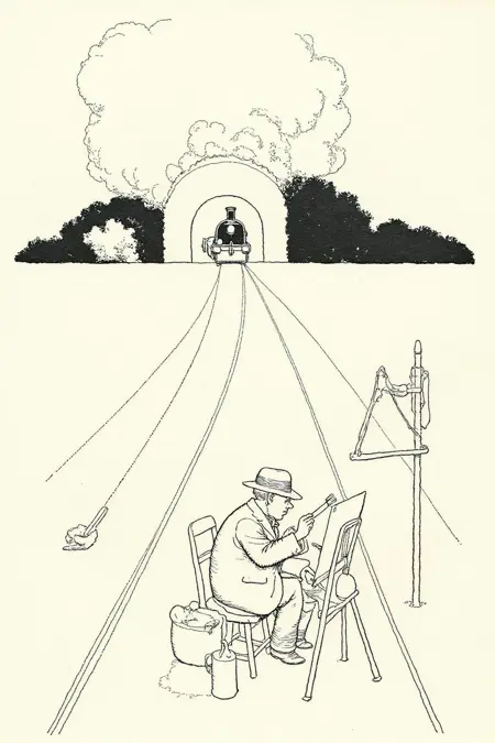 영국의 만화가, 일러스트레이터, 예술가 윌리엄 히스 로빈슨(1872년 5월 31일 – 1944년 9월 13일)의 흑백 드로잉 19점으로 학습되었습니다. 모든 드로잉은 1935년 그레이트 웨스턴 철도(GWR)가 의뢰한 그의 기묘한 작품 『Railway Ribaldry』에서 가져왔습니다. 로빈슨은 루비 골드버그의 영국 버전으로 간주됩니다. 또한 찰스 로빈슨의 어린 형제이기도 합니다.