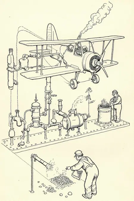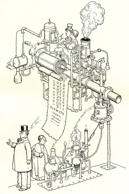 约1912年起,罗宾逊开始专注于那些为他带来持久声誉的幽默奇幻机器。这些装置通常以细致入微、伪工程学风格绘制,充满齿轮、杠杆和滑轮。他的发明巧妙地低效,讽刺了现代科技和社会对机械的痴迷。