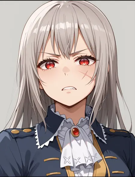 red eyes, scar on face