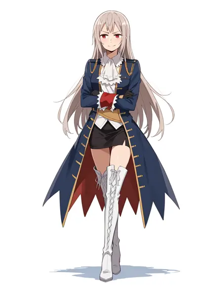 frilled collar, sash, white shirt, blue jacket, long jacket, black skirt, red cuffs
