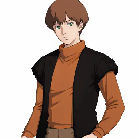 短髪、茶色の髪、前髪、緑の目、