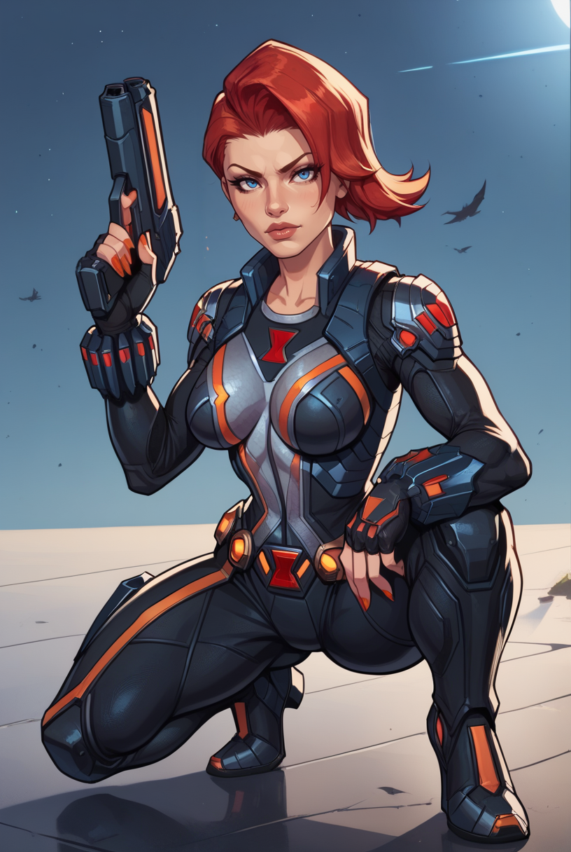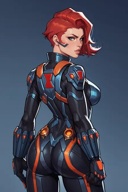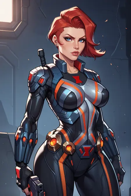 red hair, short hair, asymmetrical hair, blue eyes, futuristic bodysuit, black bodysuit, red and orange accents, black widow symbol