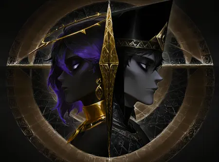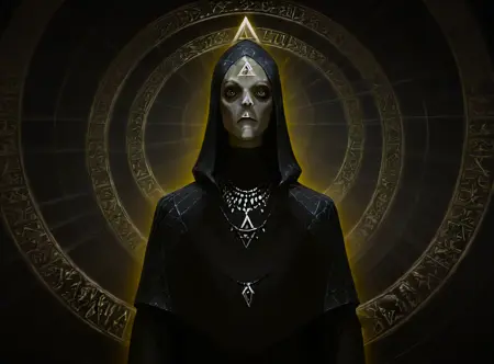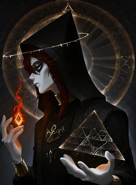 occult - hexagram - pentagram - sigil - emblem - runes - tarot - ouija - table - table_cloth - gambling - gem - apple - crow - skull - mask - hood - vest - still_life - sheet_ghost - ghost_tail - symbolism - alchemy - black_nails - grey_skin - black_skin - knife - horror_(theme) - table - throne - halo - spiked_halo - eye_of_providence - pyramid_(geometry)