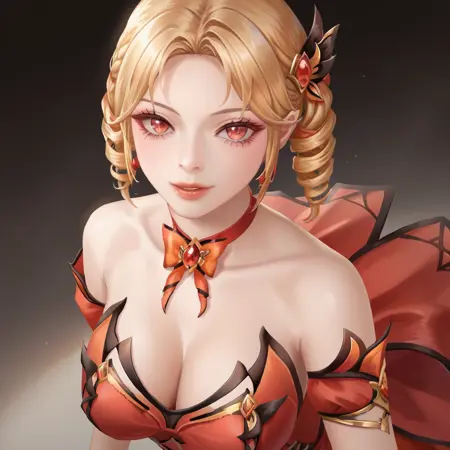 CSO_Karin, 1girl, solo, red eyes, braid, blonde hair, hair ornament, drill hair, dress, red dress, breasts, red footwear, bare shoulders, jewelry, cleavage, choker