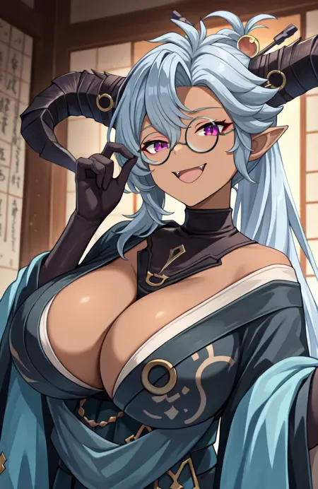 영혼의 안정자 복장(김포): F3d1el, SSFFit, 검은 김포, 드래곤 뿔, 검은 피부를 가진 여성, 안경, 둥근 안경, 흰 머리, 긴 머리, 보라색 눈, 높은 언더핀, 날카로운 귀, 가슴 노출, 어깨 드러냄, 넓은 소매, 띠, 어깨 노출, 오비, 머리 장식, 파란 김포, 긴 소매, 눈 사이에 머리카락, 샬, 팔꿈치 장갑, 머리 막대