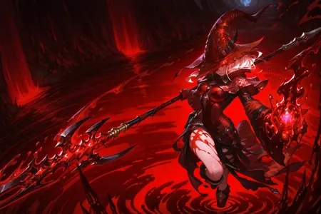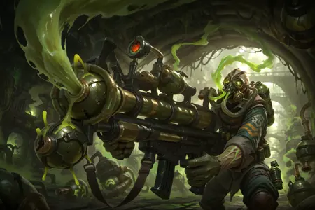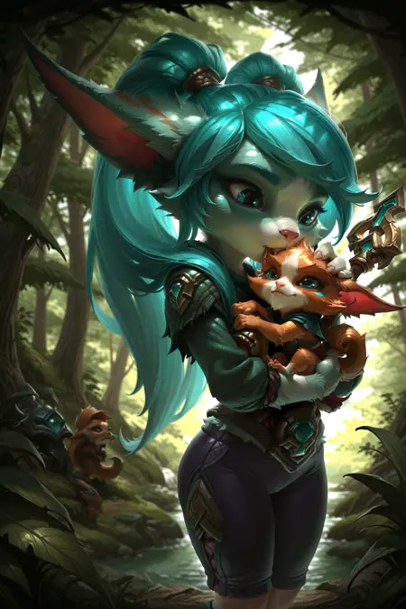 Useful tags: yordle, holding weapon, orb, monster, dynamic pose, from above, from below, foreshortening, dutch angle