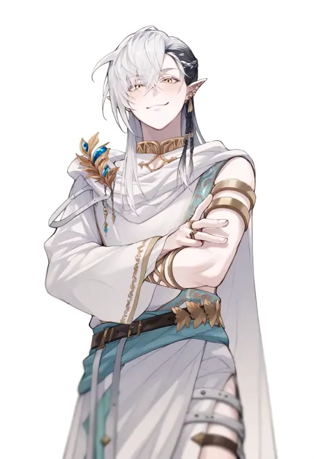 Appearances + Trigger Word: CassianFloros, 1boy, male focus, toned male, multicolored hair, white hair, black hair, pointy ears, yellow eyes, streaked hair, hair between eyes, braid, asymmetrical hair