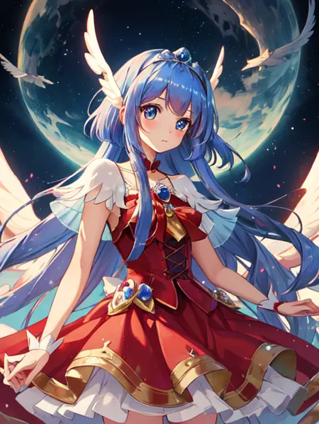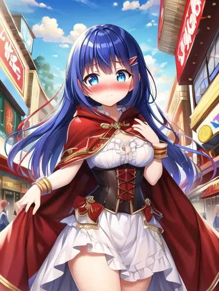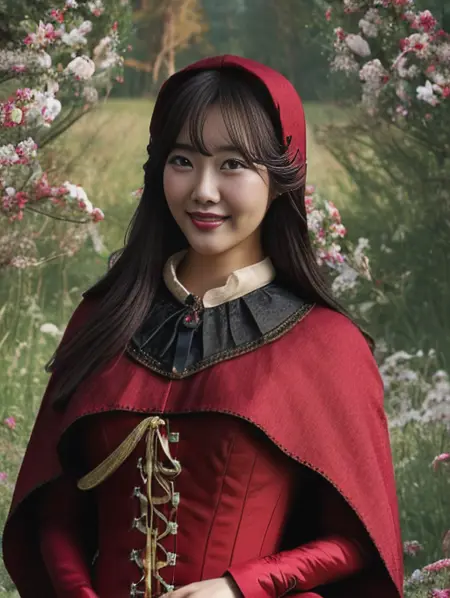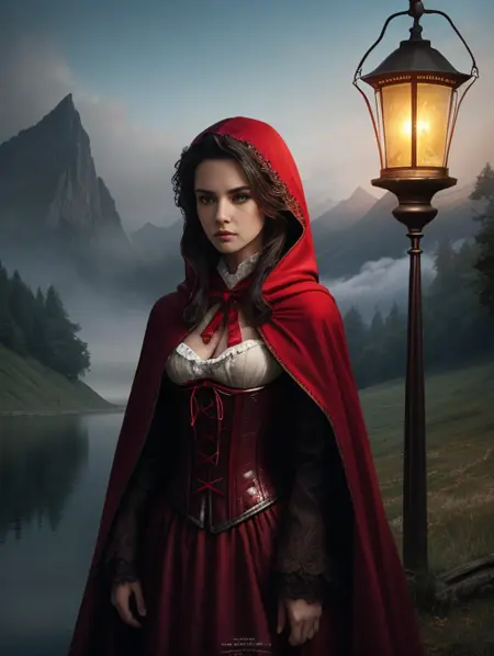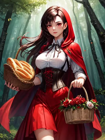 Additional words that may help: red dress, corset, red capelet, red hood,
