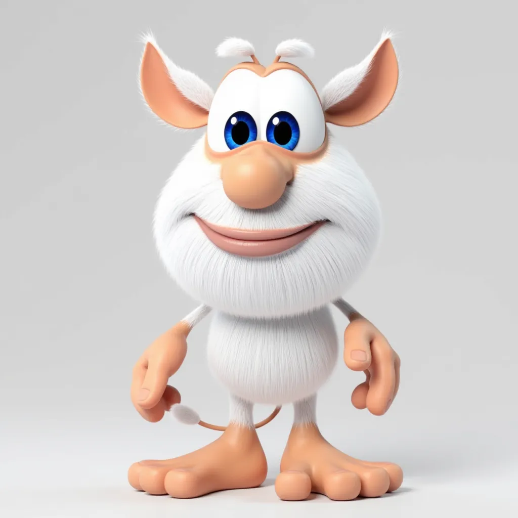 Booba 3D, white body fur, white beard and hair, big blue eyes, prominent nose, wide ears, long tail, hands with 4 fingers, feet with 3 toes, beige body