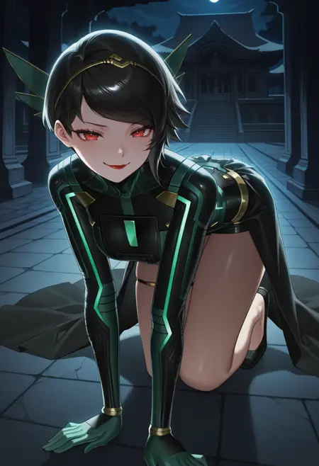 Panagia appearance: pgia, black hair, short hair, swept bangs, asymmetrical hair, hairband, headdress, snake hair ornament, red eyes, red lips, black bodysuit, mecha pilot suit, chest jewel, green gloves, black skirt, showgirl skirt, black shorts, thigh strap, bare legs