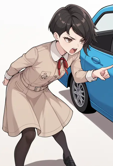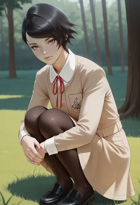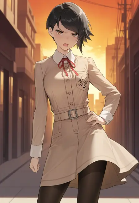 Default appearance: yoko, black hair, short hair, swept bangs, asymmetrical hair, brown eyes, brown dress, collared dress, breast pocket, neck ribbon, red ribbon, long sleeves, belt, black pantyhose