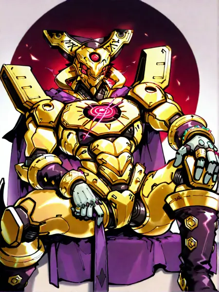 golden lord, cape, ring, jewelry, boots, bracelet, no humans, robot, armor, red eyes,double eyes,1boy,purple cape,glowing,