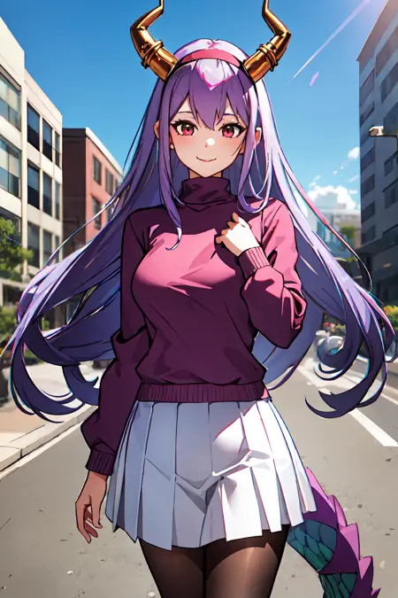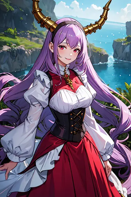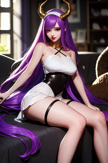 キャラクターのみ:dragon horns, dragon tail, very long hair, hairband, purple hair, red eyes