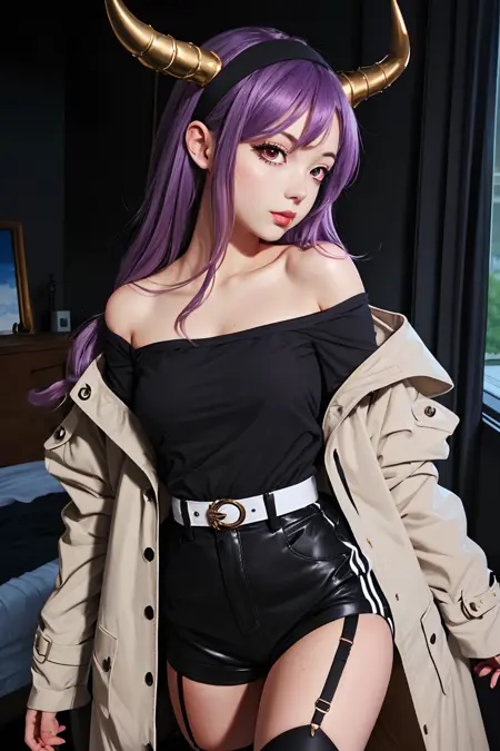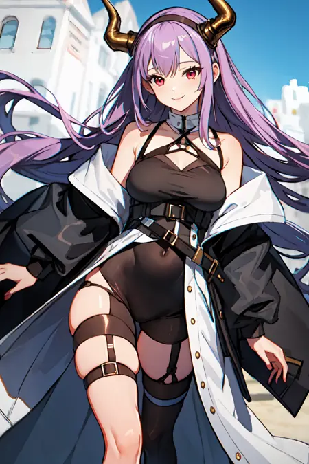 복장 적용 시: 드래곤 뿔, 드래곤 꼬리, 매우 긴 머리카락, 헤어밴드, 보라색 머리, 붉은 눈, 검은 셔츠, 검은 반바지, 게터 스트랩, 회색 코트, 어깨 노출, 벌어진 코트, (비대칭 다리 착용, 단일 허벅지 양말:1.2), 허벅지 스트랩