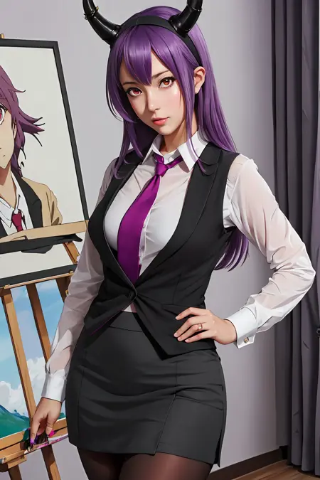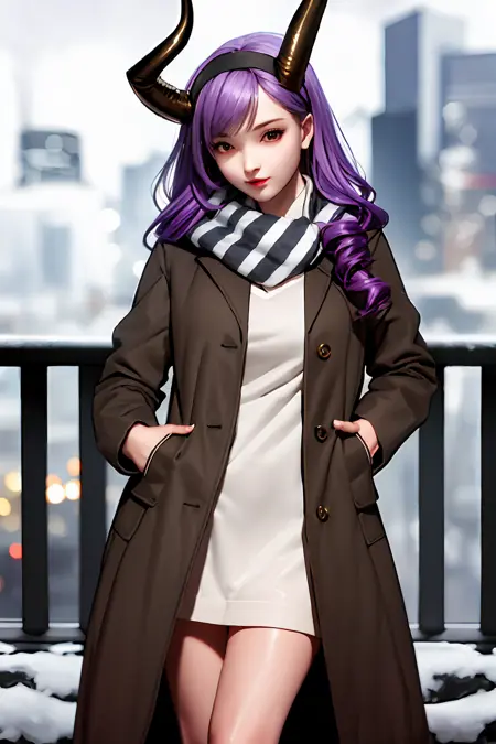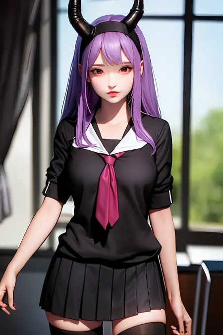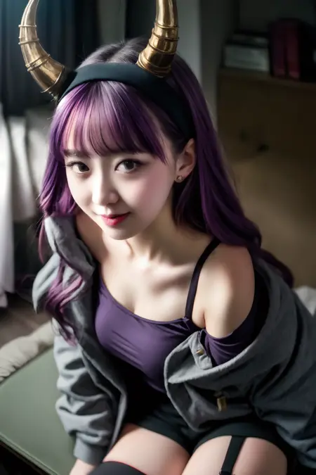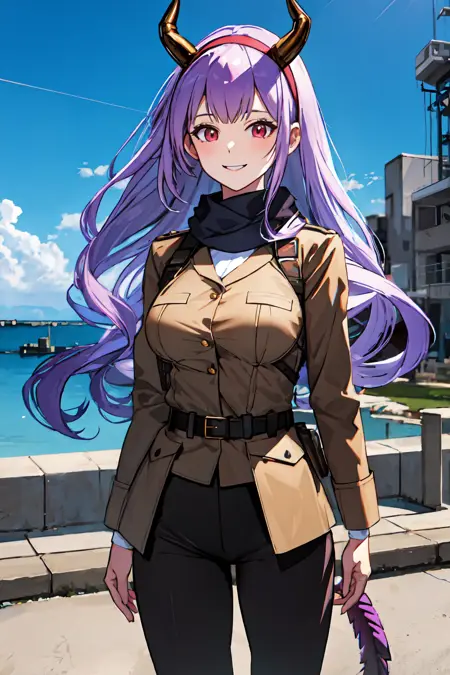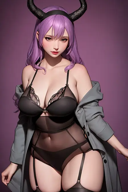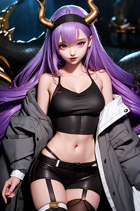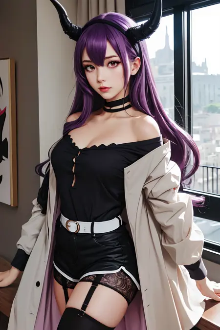 衣装付き:dragon horns, dragon tail, very long hair, hairband, purple hair, red eyes, black shirt, black shorts, garter straps, grey coat, off shoulder, open coat, (asymmetrical legwear, single thighhigh:1.2), thigh strap