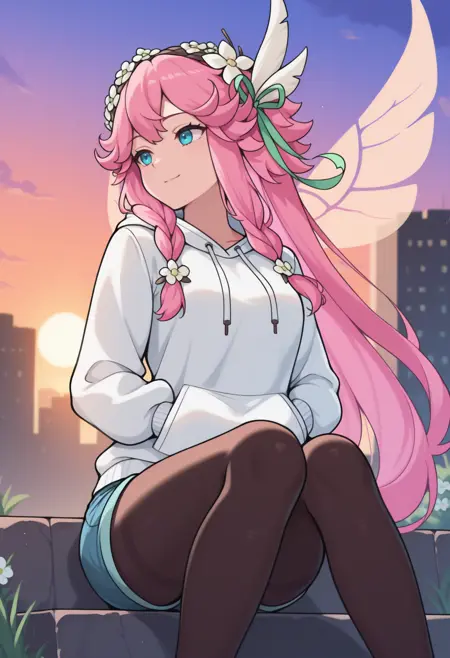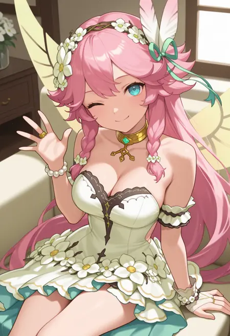 Trigger + Appearance: n0tte, fairy wings, pink hair, twin braids, hair flower, white flower, feather hair ornament, hair ribbon, green ribbon, hairband, blue eyes
