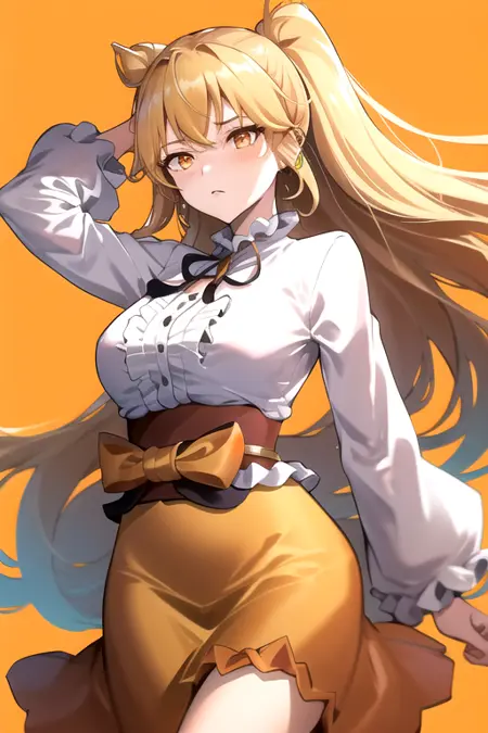 ToshikoIno, 1girl, solo, absurdly long hair, orange skirt, blonde hair, white shirt, frills, orange eyes, long skirt,