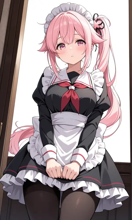 Valentine Outfit : harusamevalKC,pink hair, long hair, long sleeves, frills,maid apron, black dress, side ponytail, neckerchief, black pantyhose, maid, maid headdress, frilled dress, hair flaps,black pantyhose,