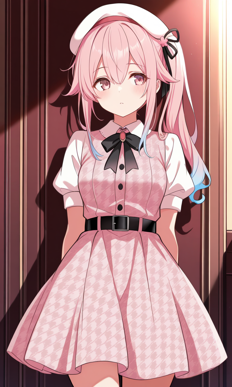 Lawson collab Outfit : harusamelsKC,pink hair, long hair, hat, ribbon, hair between eyes, blue hair, hair ribbon, short sleeves, puffy sleeves,side ponytail, puffy short sleeves, black ribbon, beret, white headwear, pink dress, black belt, houndstooth dress,white sleeves,