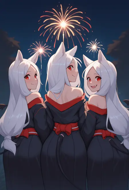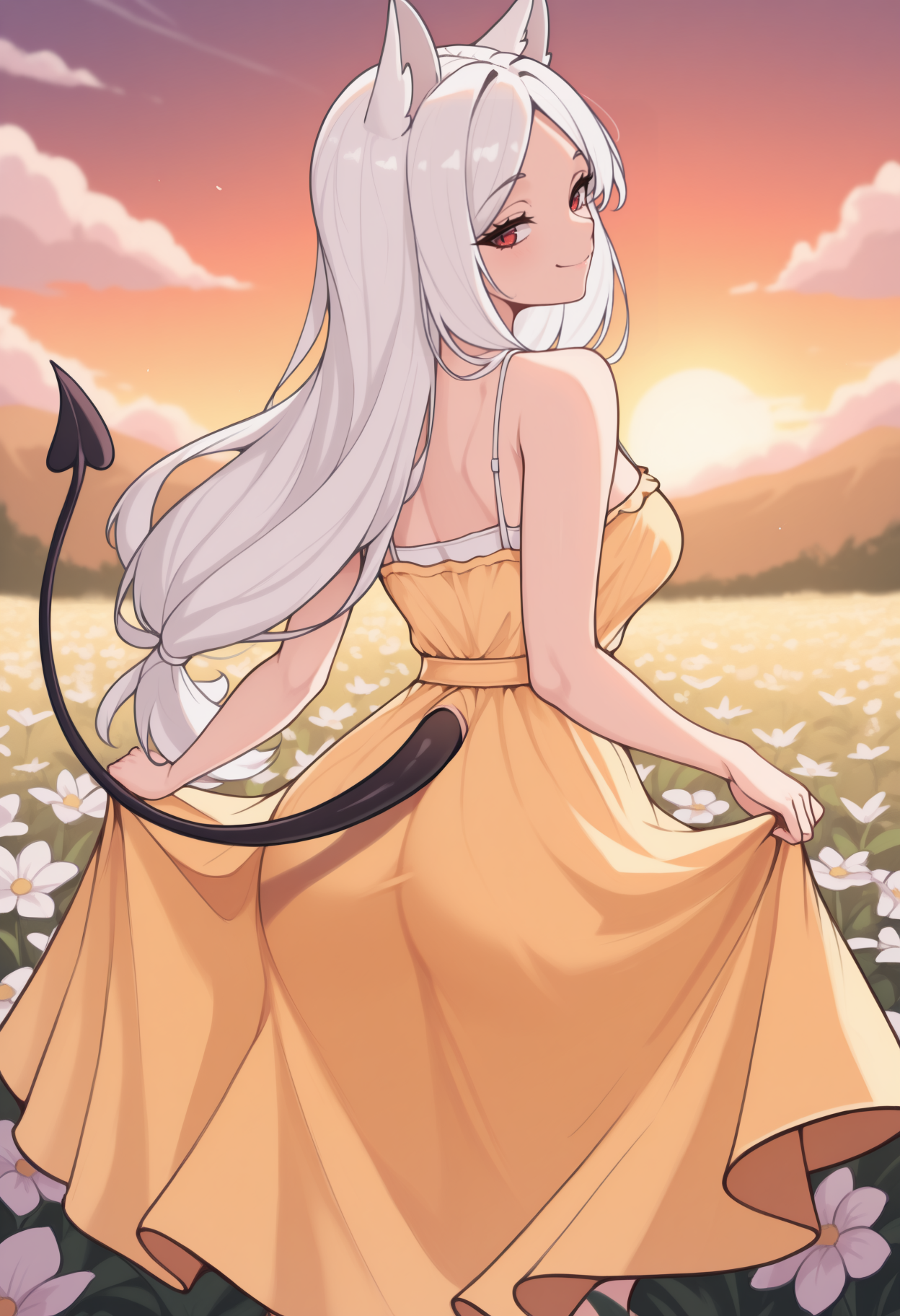 触发词 + 外观: cerb3rus, 黑色尾巴, 恶魔尾巴, 长发, 白发, 分开的刘海, 动物耳朵, 红色眼睛